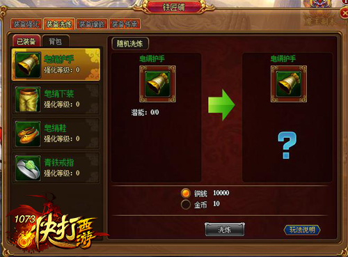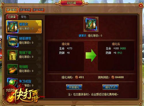《快打西游》中强化装备可以给玩家的装备提高附加属性加成,其中品质越高的装备强化所附加的属性越高。你还可以选择强化模式,开始强化、强化十次。强化装备只需要消耗铜钱,但是当铜钱不足的情况下,是无法进行强化的。