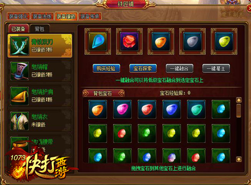 《快打西游》中一件装备可以镶嵌五颗宝石,除了“锻造”界面,玩家通过伙伴界面上方也可以进入宝石镶嵌界面。当把一颗低级宝石拖拽到高级宝石上时,低级宝石将被融合,给予高级宝石经验得到提升,但是高级宝石无法拖拽的低级宝石上融合。为了方便玩家,系统有“一件融合”选项,只需要选择想要提升的宝石,然后点击选项,系统就会把玩家背包内所有低于所选择的宝石与其融合。