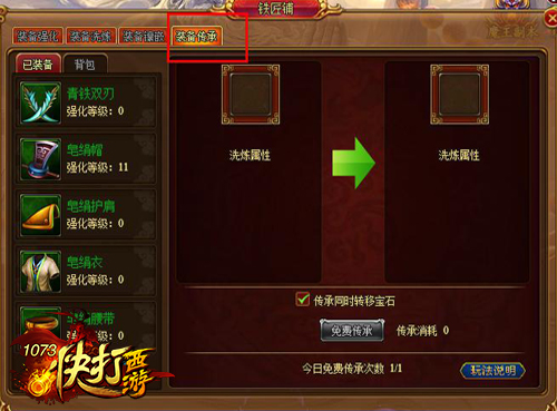 当你在准备换高等级装备时,可以直接将准备换下装备的强化等级,转移到新装备上。相同类型的装备才能进行传承(比如旧装备是戒指,新装备也是戒指)。旧装备的强化等级必须大于或等于新装备的强化等级。新装备品质必须大于或者等于旧装备品质,且品质差不超过1星。传承后新装备的强化等级根据旧装备的强化费用来计算。这里需要注意的是在准备换高等级装备时,可以直接将准备换下装备所镶嵌的宝石,转移到新装备上。每天第一次为免费,之后每次10金币递增。