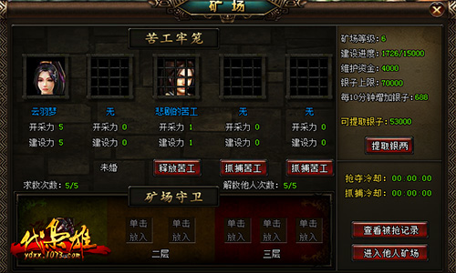 首先来看矿场系统,游戏右上角有矿场抢夺按钮,打开矿场界面点击抓捕苦工,将其他玩家抓捕为苦工为你挖矿赚取银子!单击一个玩家进入战斗,战胜即可成功抓捕,点击进入他人矿场,可在别人的矿场里抢夺银子。在矿场守卫栏里点击守卫空格可将门客、美人放入矿场,其他玩家来抢夺你的矿场时需要战胜你的守卫才可抢走银子,所以让自己的守卫强大也是另一种获得资源的方法。