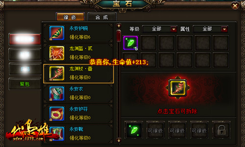 除了矿产,宝石也是玩家实力重要的组成部分,给装备镶嵌宝石能大幅提升你的战斗力!首先玩家需要选择一件装备,可将该装备放入镶嵌位,在界面右下方查看该装备可镶嵌宝石的剩余孔数,标记为“可镶嵌”的空格表示可以镶嵌宝石,如果是一把小锁的,说明该位置不可镶嵌宝石,装备品阶越高,可以镶嵌宝石的孔数越多。若想把镶嵌在装备上的宝石取下来,点击已经镶嵌的宝石即可快速卸下,所以只用准备一套顶级宝石就可以永久使用了。