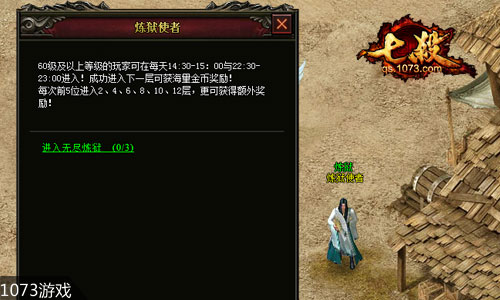 无尽炼狱副本每天的14:30-15:00和22:30-23:00两个时间段内开启的。玩家等级达到60级以上便可以进入无尽炼狱。无尽炼狱其实并不是无尽的,一共有14层,从当前层次进入下一层需要使用一个通行证,通行证由击杀boss或者精英怪百分比爆出,但使用时有一定的失败几率,失败则呆在当前层,又或者使用10元宝百分比进入。