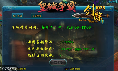 1073 《剑踪》皇城争霸是一场精彩的城池攻防战,每周二、四、六21:30-22:30开启。以帮派为基本单位,每一个帮派成员为占领皇城,展开惊天动地的大厮 杀。进攻的需要精心策划,选择好正确的进攻道路。防守的也要层层布防,将每一个人的作用发挥到最大。智慧与实力的结合,荣誉和权势的对决,如此精彩激情的 战役,你怎能不爱,怎能不参加?