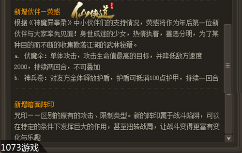 新年迎来大更新!1073《仙侠道》新年伊始,给力的春节活动刚刚结束,新的剧情即将展现在大家面前。新的城镇新的伙伴、称号系统改版以及新增的暗面阵印丰富了游戏玩法,急速推进的剧情会将整个故事推向高潮。