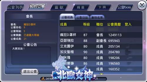 公会成员里面可以查看公会的全部成员及信息,而公会日志里面显示公会成员喂养灵兽的操作信息。所谓灵兽,是公会全体成员共同喂养的神兽,它是公会的象征,尤其在公会战的活动中,强大的神兽可以给公会带来很大优势,详情玩家们参考《北欧女神》公会战的资料。同时,喂养灵兽可以给玩家带来荣誉提升,玩家千万不要错过,这玩意儿每天每人只能喂一次,稀罕的很哟!